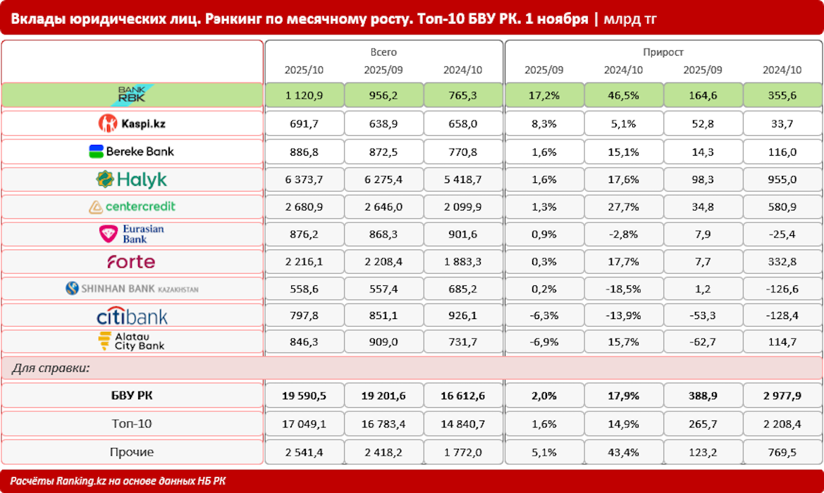 Наибольший прирост вкладов бизнеса среди десяти крупнейших банков продемонстрировал Bank RBK. За месяц объем депозитов в этом фининституте вырос сразу на 17,2% и превысил 1,1 трлн тенге. При этом положительная динамика носит устойчивый характер: в годовом сравнении банк увеличил портфель вкладов юридических лиц на 46,5%, значительно опередив средние показатели как по сектору в целом, так и среди крупных БВУ. Такая динамика свидетельствует о высоком уровне доверия со стороны казахстанского предпринимательского сообщества.